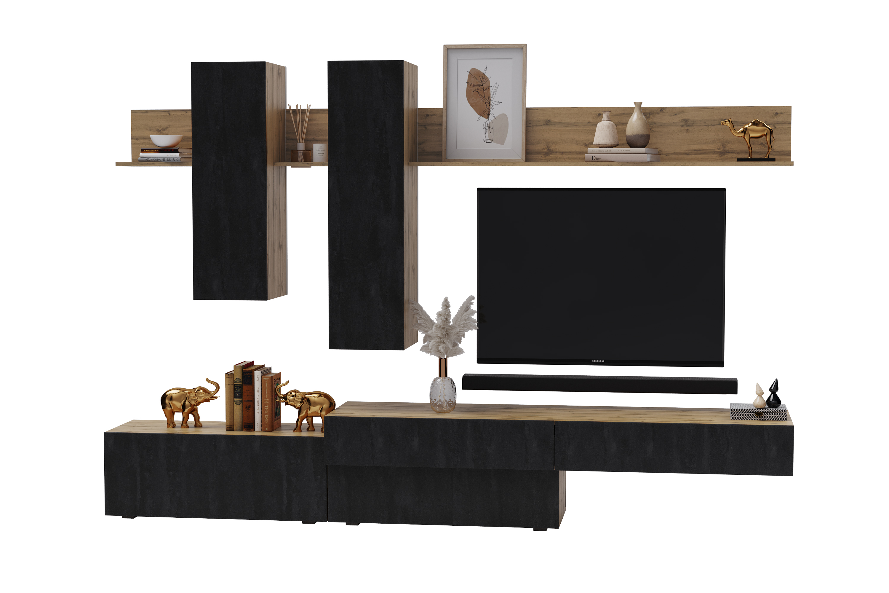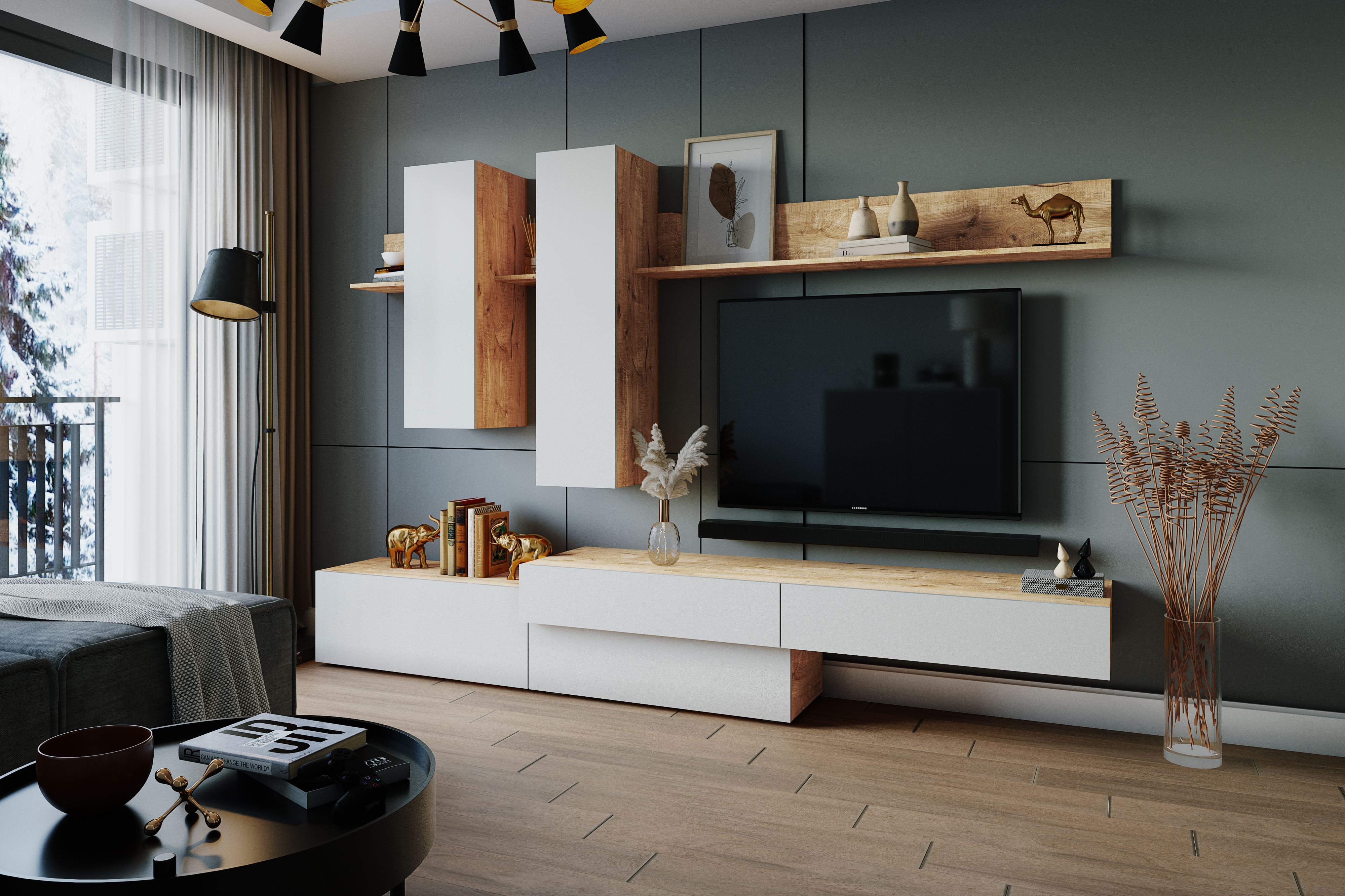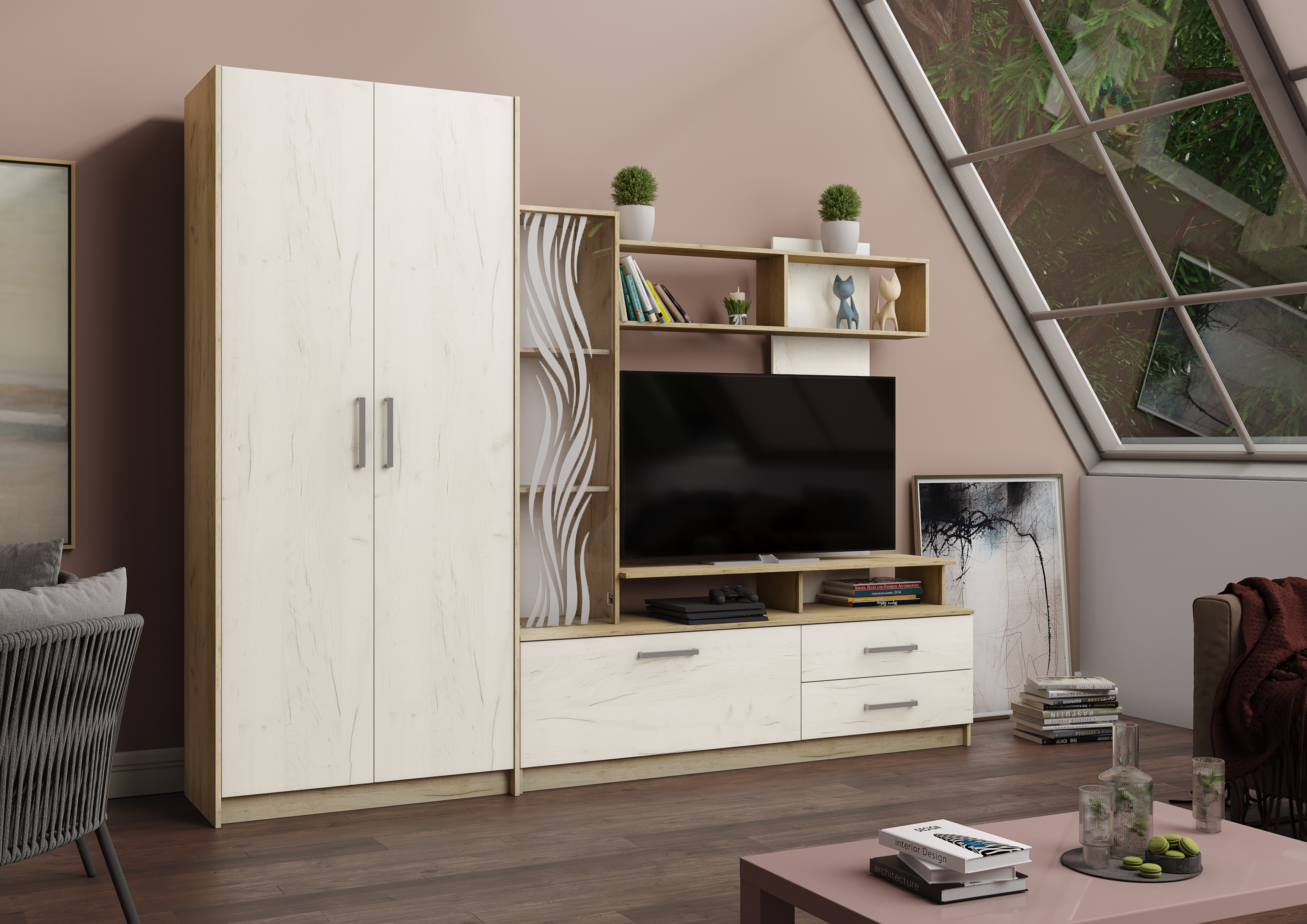 Описание ТВ- Ш 1700мм В 1803мм Г 472мм Шкаф Ш 898мм ЛДСП Корпус \Фасад - Дуб Вотан\ Белый или Дуб Крафт серый\ Дуб крафт белый Стоимость Центральная секция 14830р Шкаф 12800р